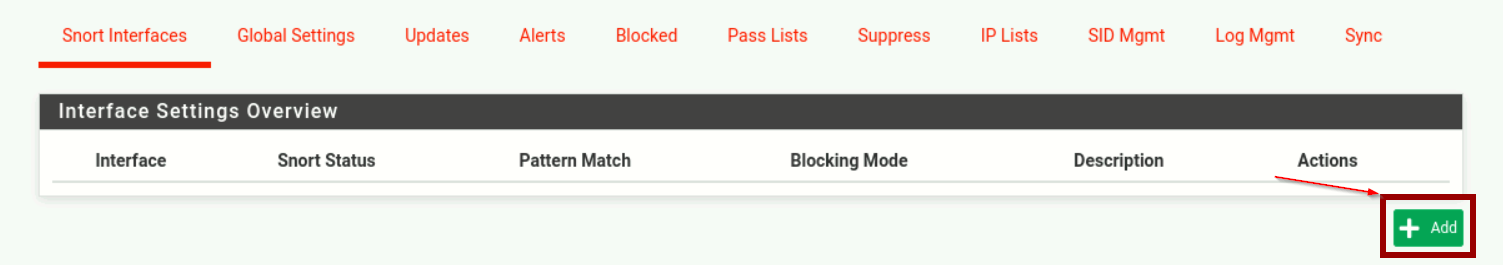 On se rend dans le menu Services > Snort, où on va pouvoir spécifier une interface du Firewall à écouter, lui ajouter des règles, et modifier la configuration de Snort.