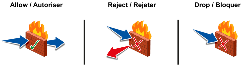 Autoriser est l'action principalement utilisée dans les Firewall aujourd'hui. La différence entre Rejeter et Bloquer réside dans le fait que Rejeter implique l'envoie d'un message de refus à l'émetteur. Ainsi, l'action Bloquer est à privilégier si vous souhaitez interdire une connexion explicitement.