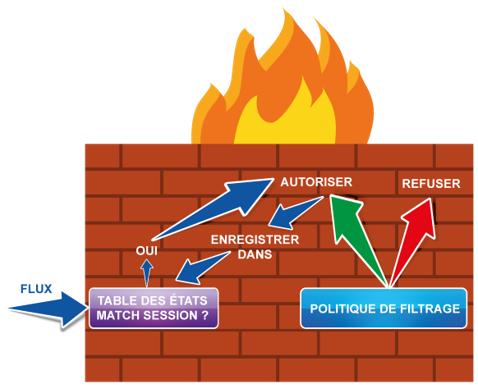 À l'arrivée d'un paquet, le Firewall consulte d'abord sa table d'état pour vérifier son appartenance à une connexion existante avant de consulter la table de routage.