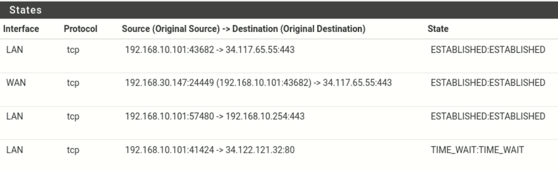 Le tableau ci-dessus provient de la table d'état d'un pfsense, on peut constater 3 connexions établies, ainsi qu'une connexion en cours d'arrêt.