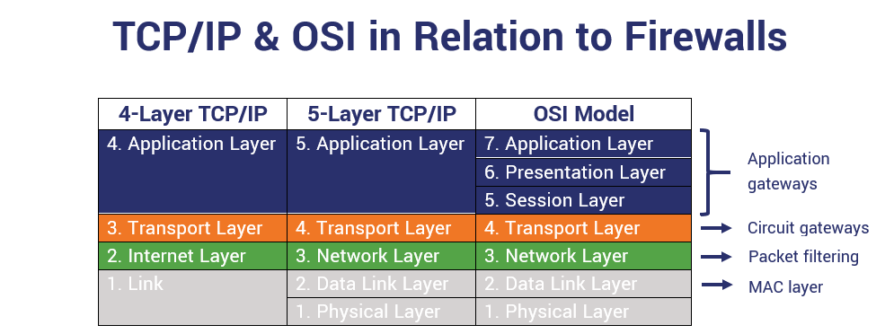 Traditionnellement, la fonctionnalité de Firewall travaille sur les couches 3 et 4 du modèle OSI (2 et 3 de TCP/IP). Toutefois, la notion de firewall applicatif est aujourd'hui un élément à connaître, qui étend ce périmètre de travail aux couches supérieures.