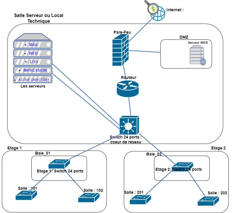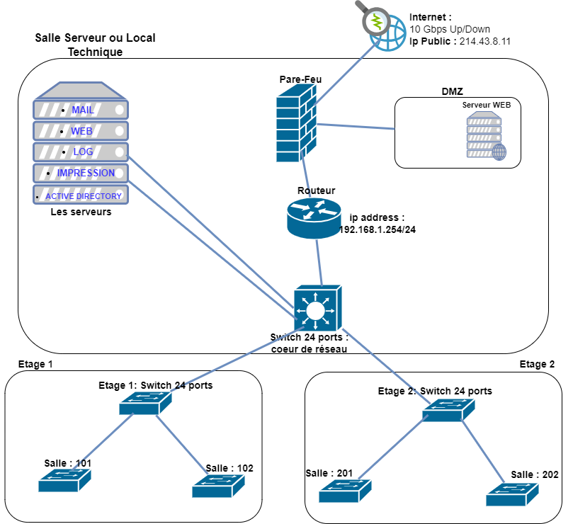- Infrastructure : câbles Ethernet, fibre optique, armoires réseau
