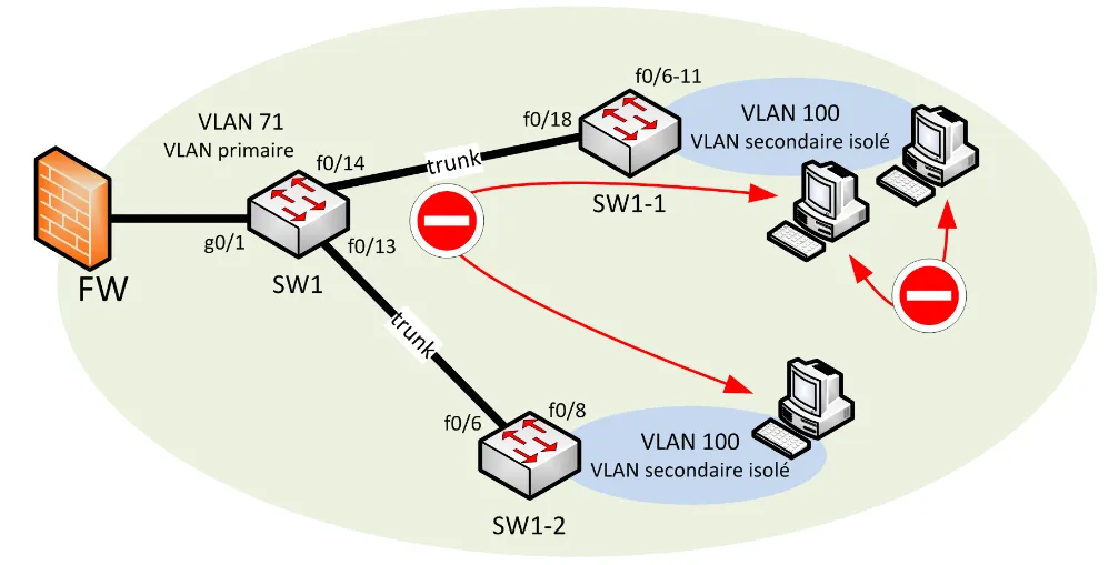 Exemple : Dans le VLAN primaire 71, le VLAN secondaire isolé 100 permet aux terminaux de communiquer uniquement avec leur passerelle (FW), sans communication possible entre eux.